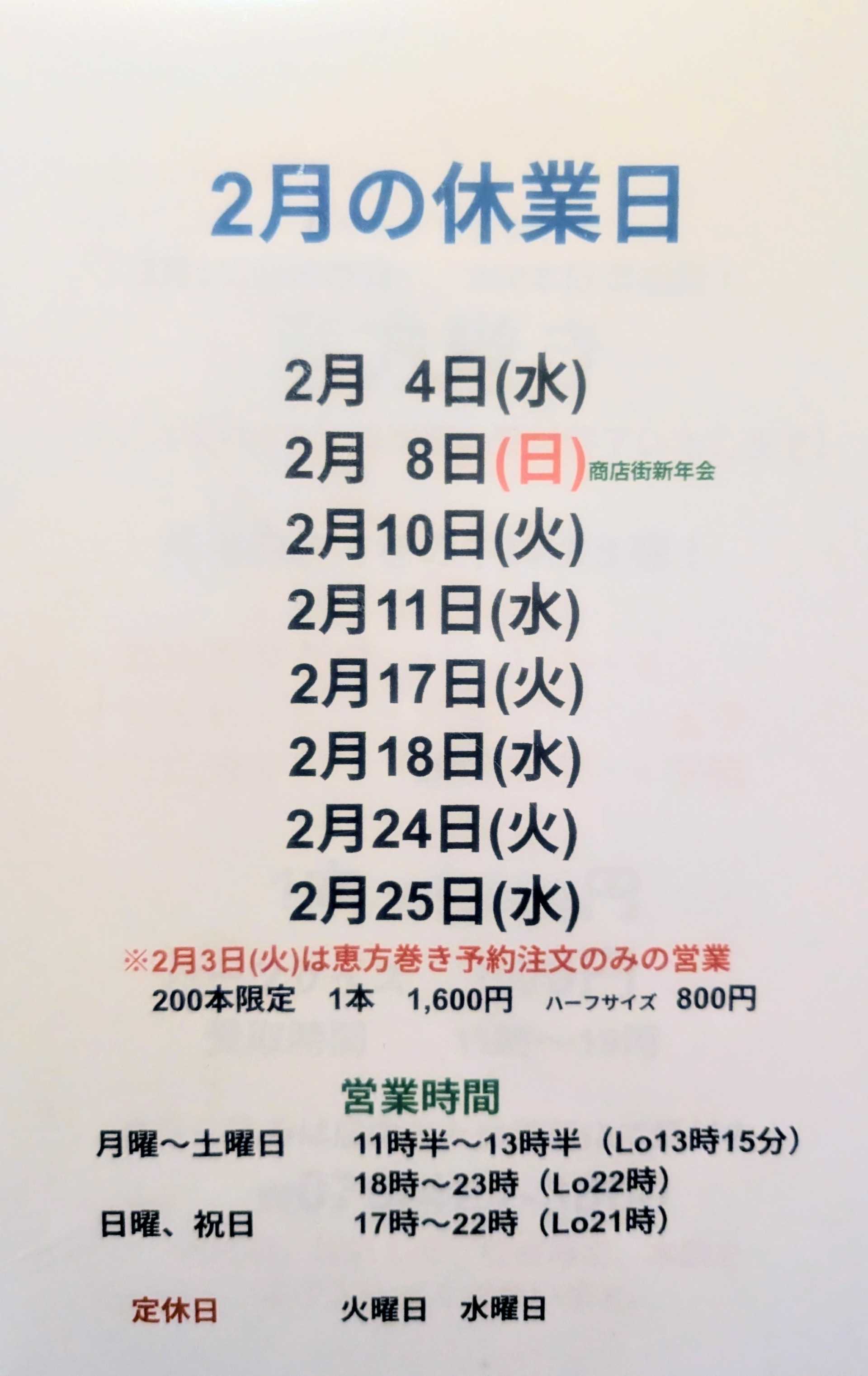遅ればせながら2月の休業日を。